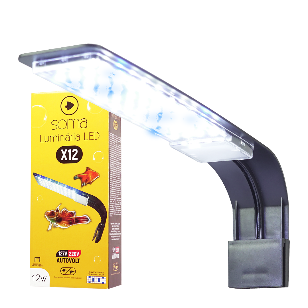 Iluminação potente que valoriza plantas e peixes. Marca Soma.